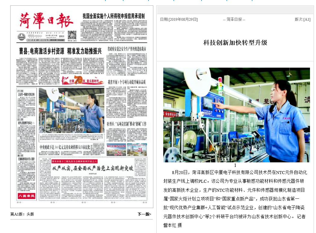 2019年8月29日《菏澤日報(bào)》報(bào)道:“科技創(chuàng)新加快轉(zhuǎn)型升級”。中廈電子科技有限...